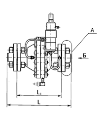 Затвор 2 выполнен в виде тонкостенной трубы и связан с мембранным приводом 4 с помощью диска 5. В исходном положении затвор прижимается к седлу возвратной пружиной 3. В полость «А» привода через отверстие «Б» подается выходное давление, а в полость «В» через отверстие «Г» подается давление управления от задающего устройства. Отверстие «Д» во фланце корпуса служит для подачи входного давления к задающему устройству.
