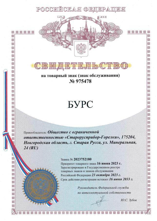 Сообщаем вам, что с 23 октября 2023 года ООО «Старорусприбор-Горелки» является единственным правообладателем на использование товарного знака БУРС.